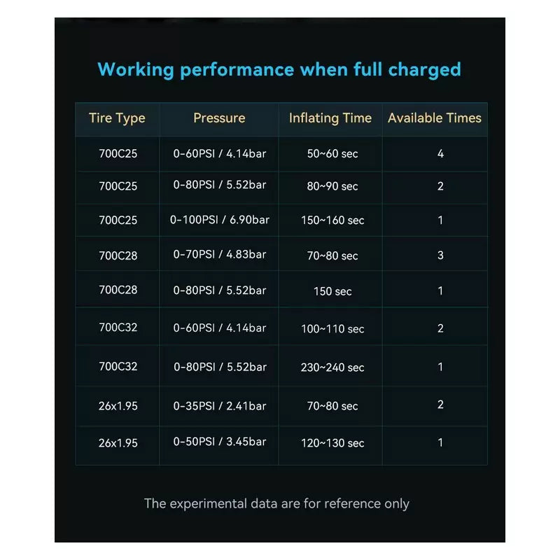 - Batteria ricaricabile che richiede solo 20 minuti per una ricarica completamente. Con una carica completa, può gonfiare due pneumatici 700*25C da 0 a 80 Psi.