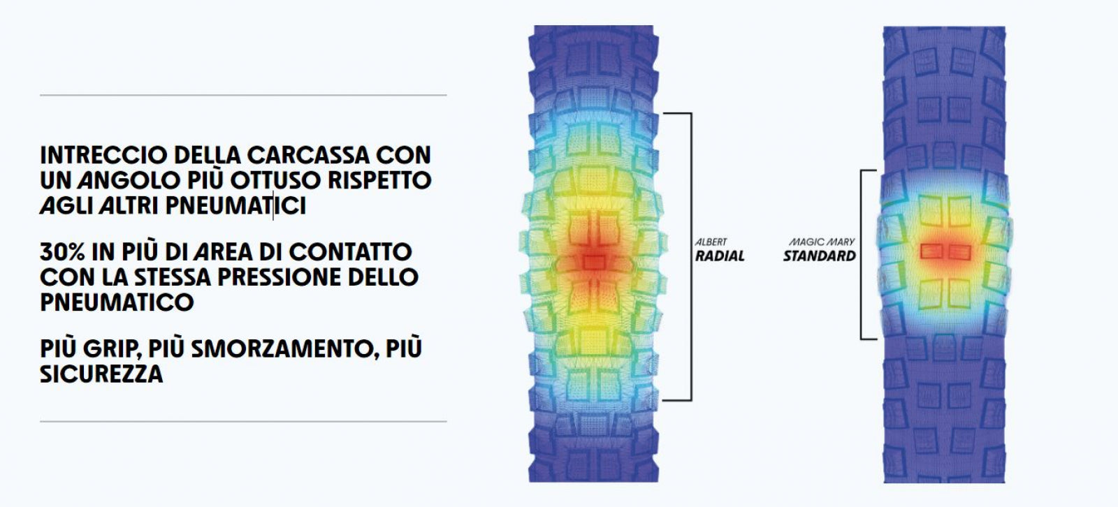 - Aderisce letteralmente al terreno poiché lo pneumatico si deforma in modo più preciso