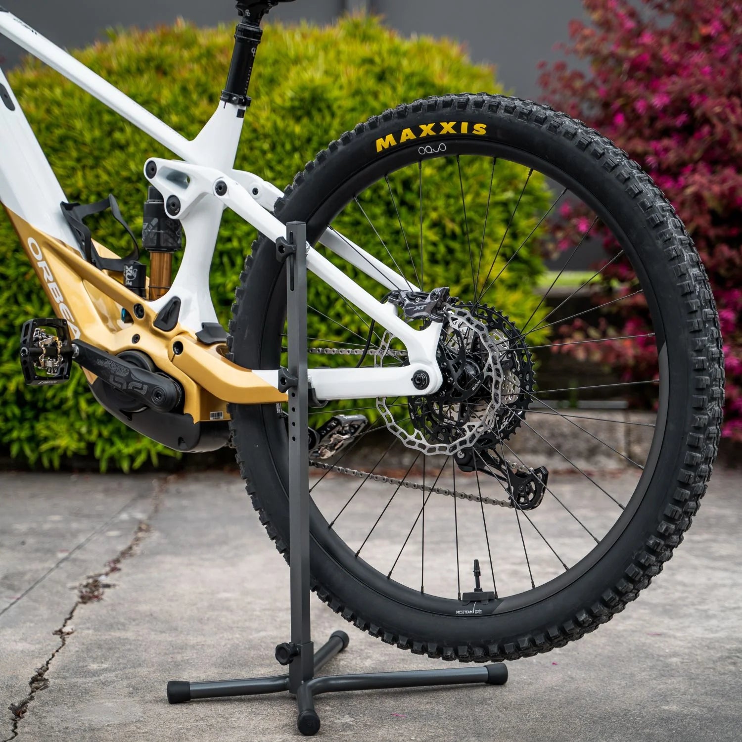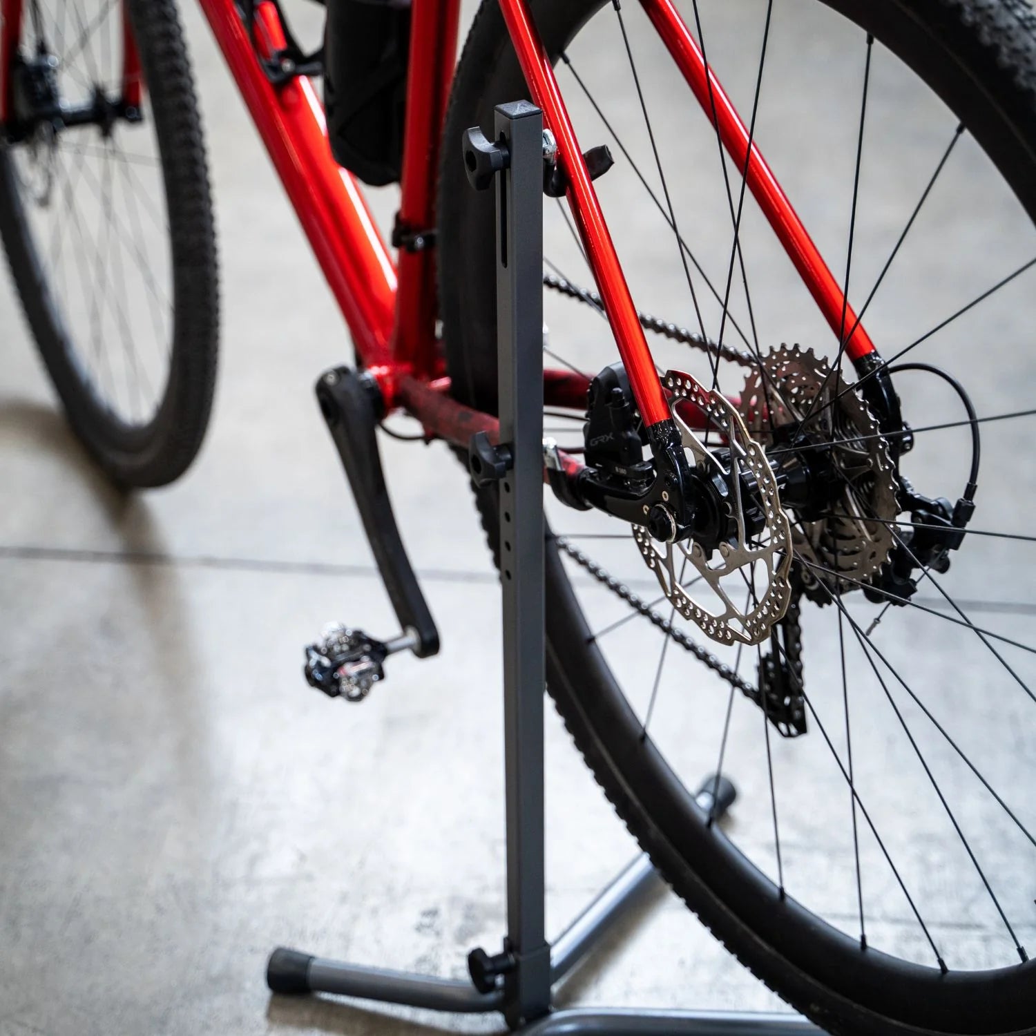 Portabici universale regolabile in altezza e inclinazione, realizzato per assicurare la bici al carro e poter girare le pedivelle grazie alla ruota posteriore sollevata da terra.