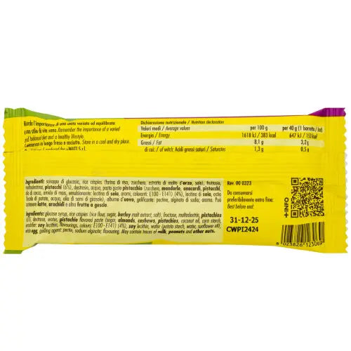 Sciroppo di glucosio, rice crispies (farina di riso, zucchero, estratto di malto d’ orzo, sale), fruttosio, maltodestrina, pistacchi (6%), destrosio, acqua, pasta gusto pistacchio (zucchero, mandorle, anacardi, pistacchi, olio di cocco, amido di mais, emulsionante: lecitina di soia, aromi, coloranti: E100 – E141)(4%), lecitina di soia, ostia (fecola di patate, acqua, olio di semi di girasole), albume d’uovo, gelificante (pectina, alginato di sodio), aroma. Può contenere tracce di latte, arachidi e altra frutta a guscio.
